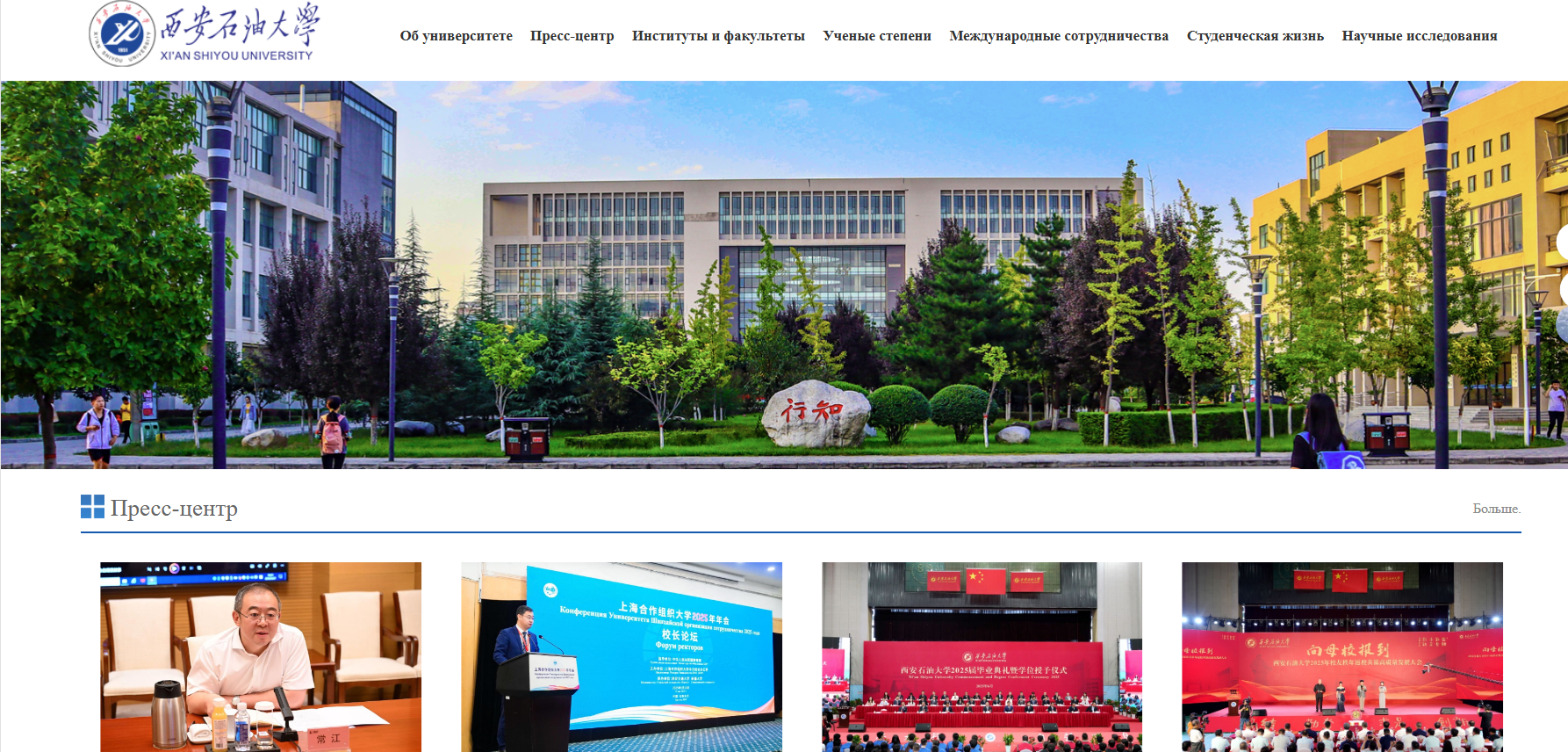 俄文主页聚焦学校核心发展成果,开设学校概况(об университете)、新闻中心(Пресс-центр)、院系介绍(Институты и факультеты)、学术学位(Ученые степени)、国际合作(Международные сотрудничества)、校园生活(Студенческая жизнь)、科学研究(Научные исследования)等特色板块,系统呈现学校在人才培养、科学研究、社会服务等方面的综合实力,尤其突出国际化办学的鲜明特色与丰硕成果,为俄语世界打开一扇了解西石大的全新窗口。
