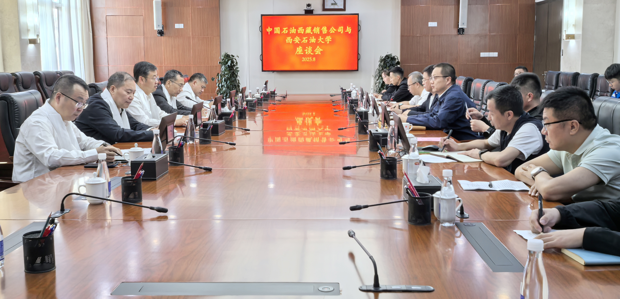 8月23日,王进富一行与中国石油西藏销售公司(简称“西藏销售”)总经理徐启东(财务管理1999届校友)、副总经理赵汉宝,青藏管道公司党委书记李国锋等有关负责同志座谈交流。王进富对西藏销售长期以来给予校友提供的成长和平台表示衷心感谢。他梳理和回顾了学校历史发展脉络,介绍了学校第三次党代会召开以来取得的成效、形成的“三小三大三氛围”。他指出,学校近年来坚持开放办学,紧扣能源行业发展需求,深化产教融合,凝聚学校优势,聚焦企业需求,大力开展与行业企业的深层次合作。徐启东对母校来访表示欢迎和感动,对母校近年来给予公司优秀人才的输送表示衷心感谢,对母校近年来取得的成绩表示骄傲自豪,并介绍了公司的基本情况及在高原地区的能源保供体系、清洁能源替代与数字化转型等方面的实践与成效。双方均表示在人才培养、科学研究、营销体系构建、学生实习就业、员工继续教育等方面加深合作。